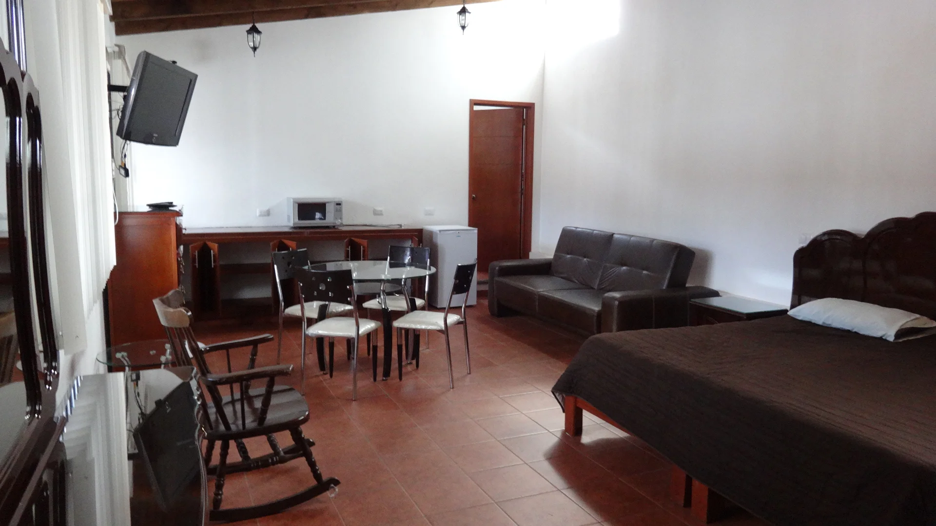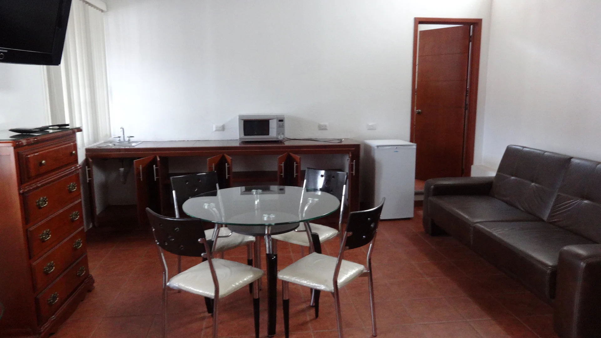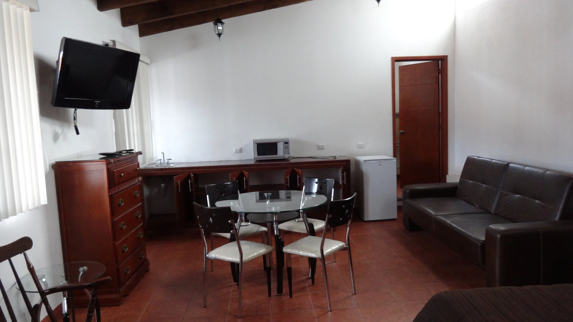 Nuestra habitación 110 es un amplio espacio con cama matrimonial, desayunador, cocineta, love seat, dos burós y cajonera, además puedes disfrutar de televisión por cable o de navegar en nuestro internet de alta velocidad de forma inalámbrica (200 Mb de ancho de banda). Un amplio menú de la cafetería disponible en nuestra agradable terraza. Cajón de estacionamiento y acceso al gimnasio opcionales por un pequeña tarifa adicional. Servicio de lavandería con autoservicio con costo.